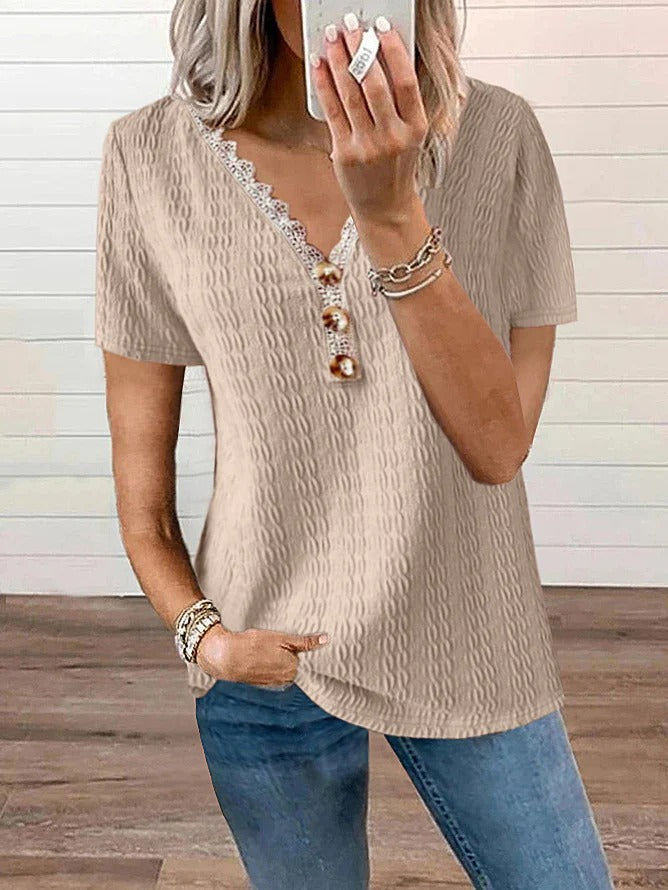 Casualowy T-shirt z Krótkim Rękawem i Dekoltem w Serek o Stylu Warkoczowym Damski | Idealny na Wiosnę/Lato