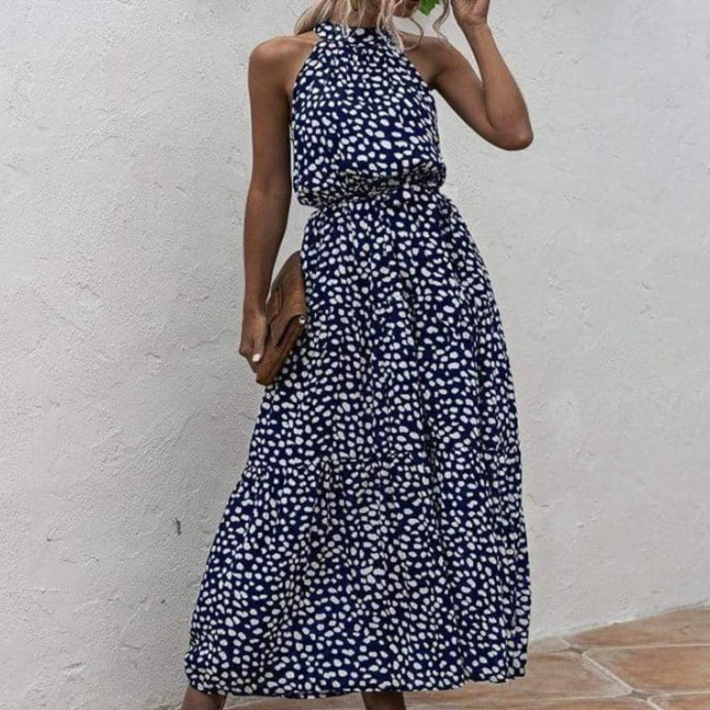 Długa sukienka bez rękawów o klasycznym kroju z dekoltem halter. Sukienka rozszerza się ku dołowi, tworząc luźny fason odpowiedni do różnych stylizacji.