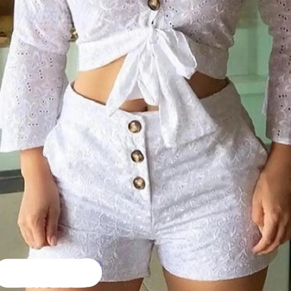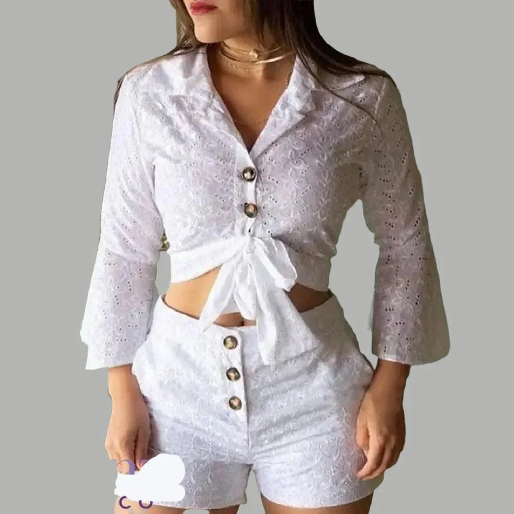 Elegancka Damska Biała Bluzka z Koralikami i Szortami