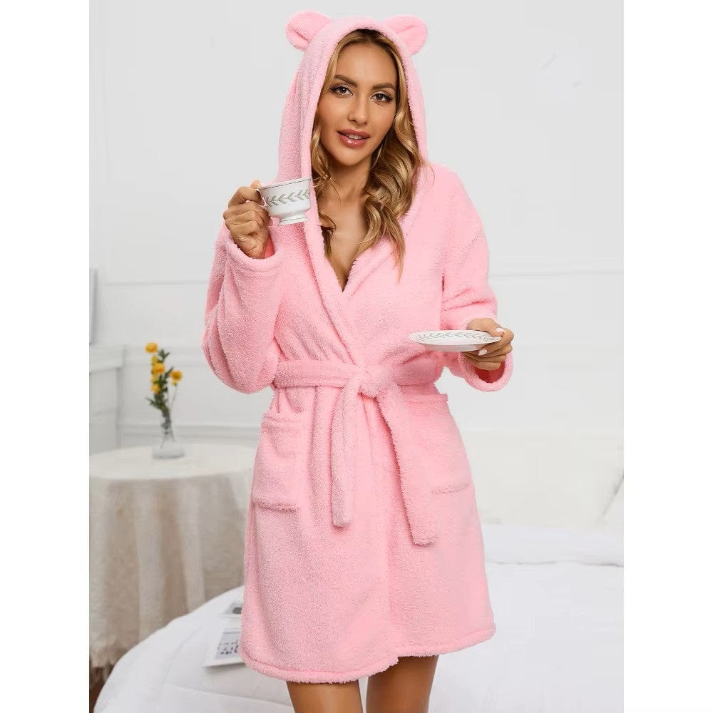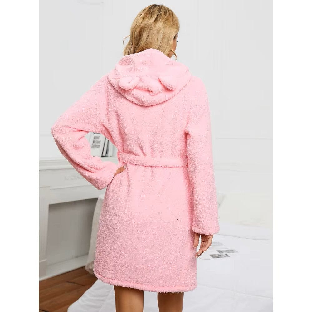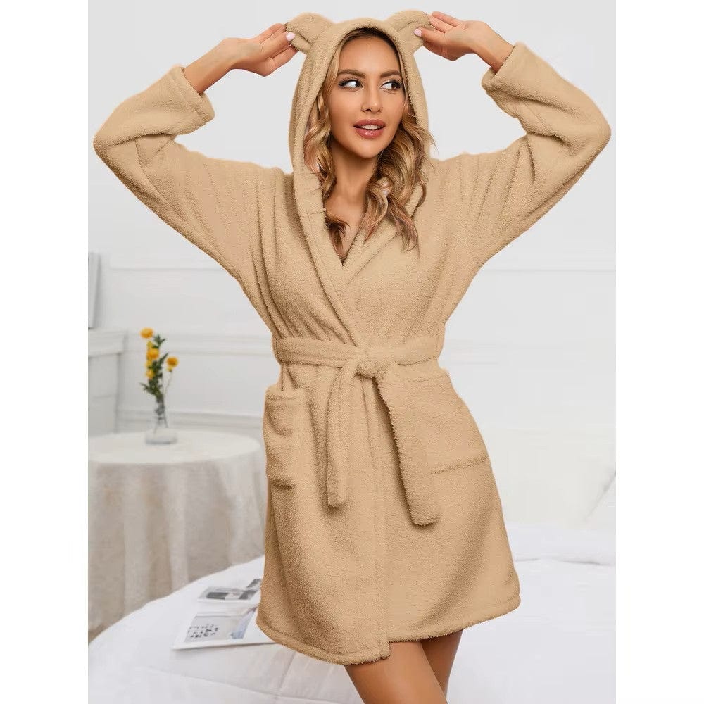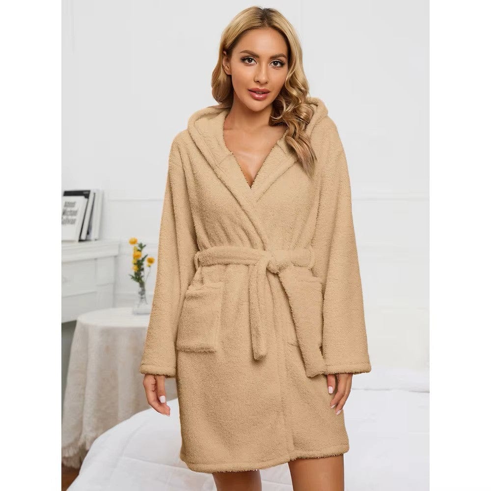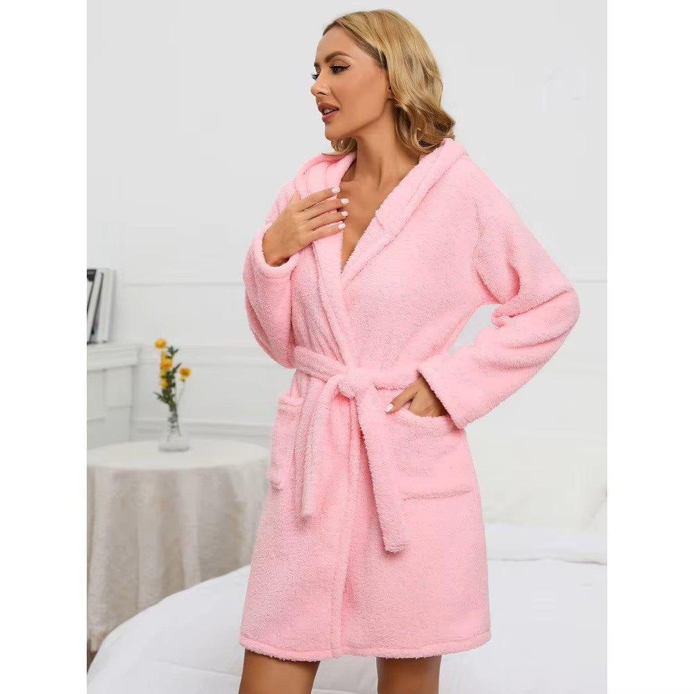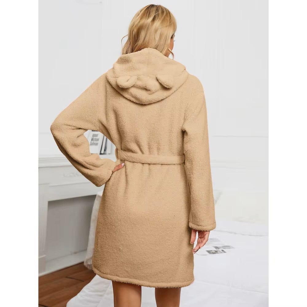 Damski Ciepły Szlafrok z Kapturem, z Talią i Kieszeniami