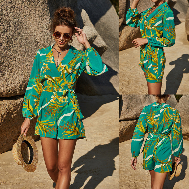 Damski Kombinezon Krótki z Kopertowym Dekoltem i Paskiem