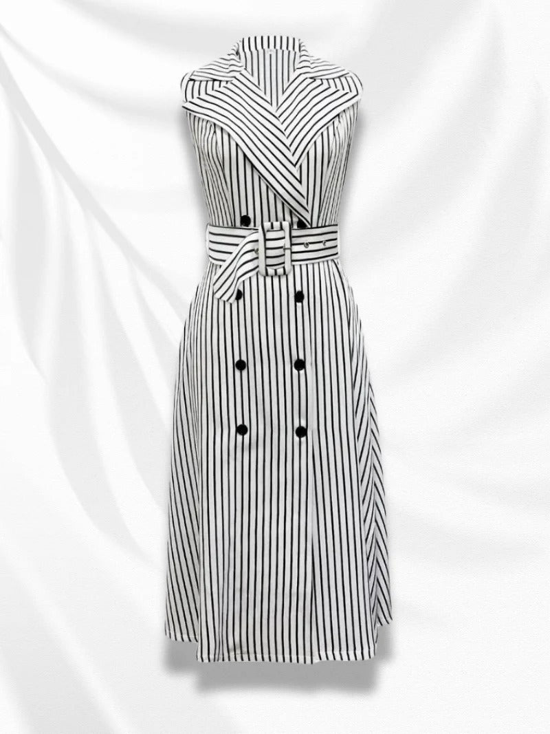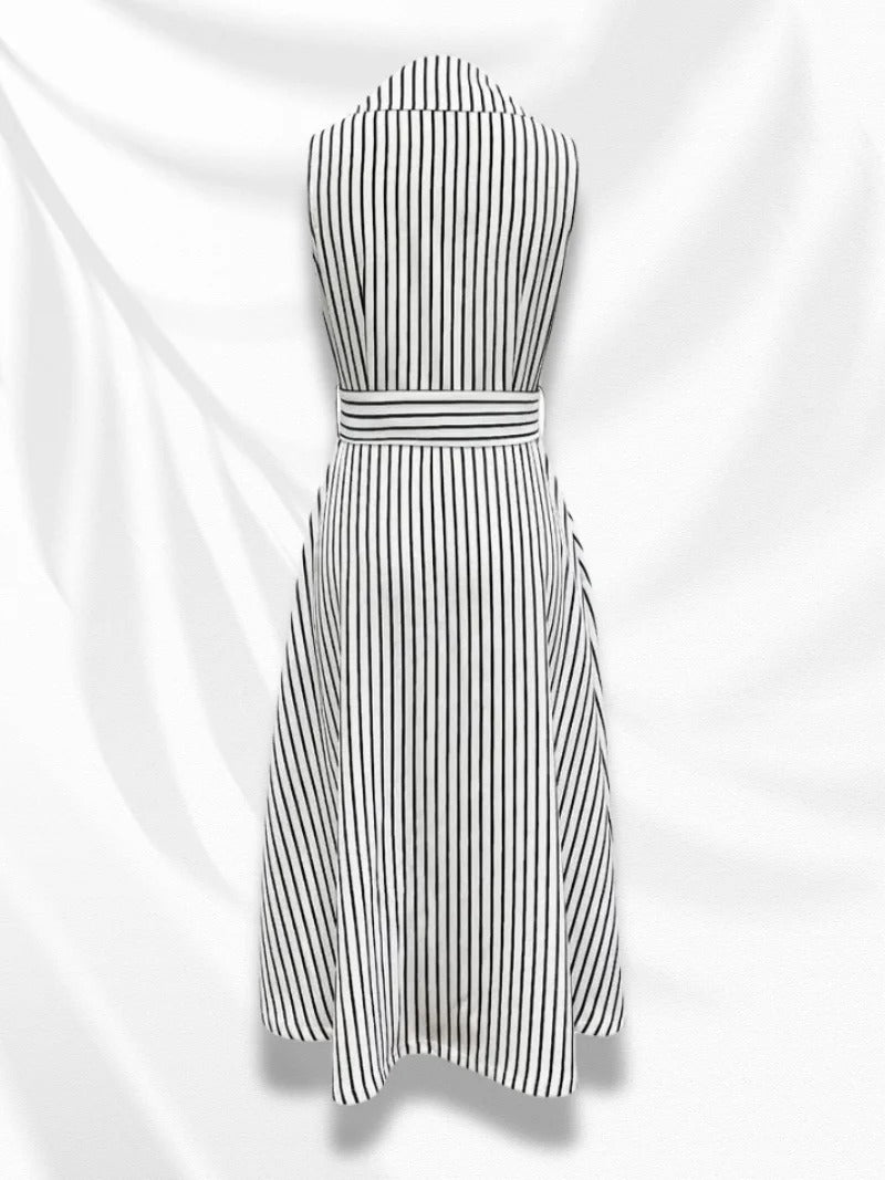 Elegancka Dwurzędowa Sukienka w Paski z Kołnierzem i Paskiem Damski | Idealna na Wiosnę/Lato