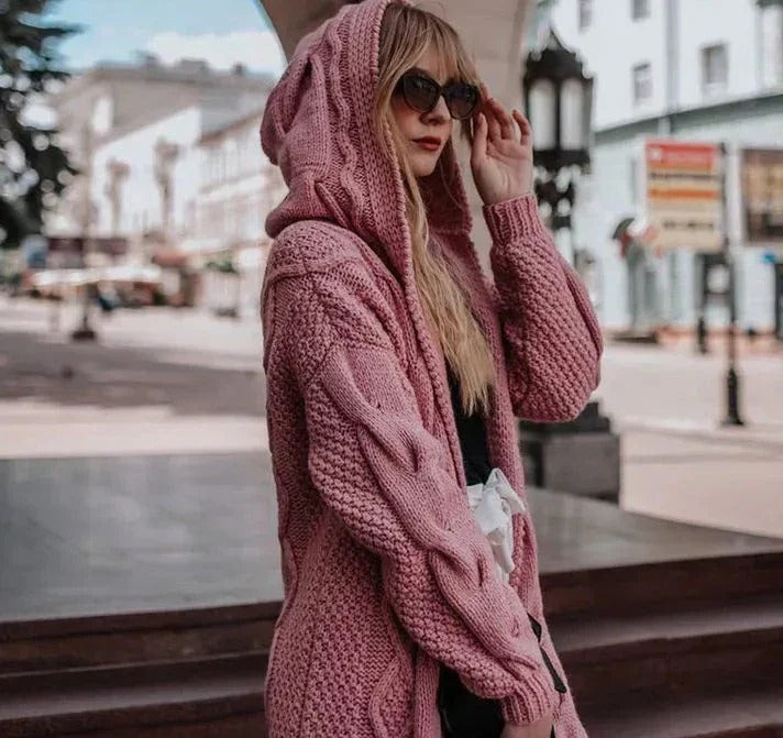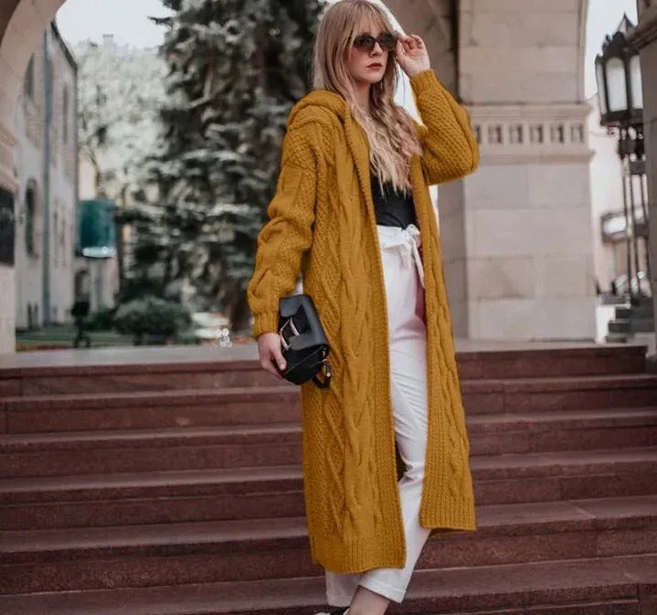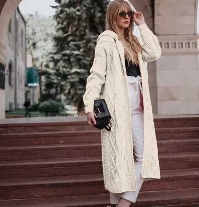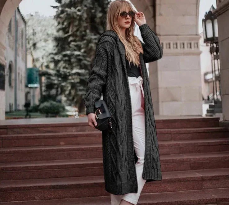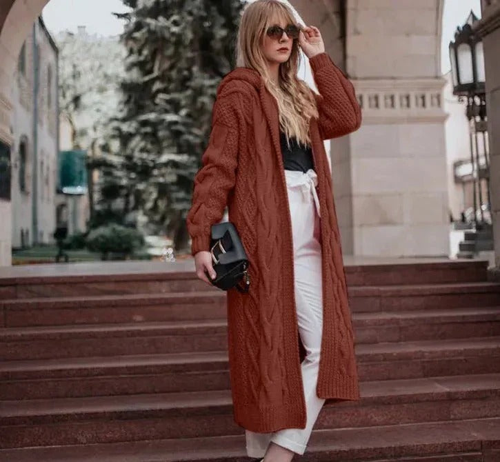 Elegancki Długi Pleciony Kardigan Z Kapturem Damski | Idealny na Wszystkie Pory Roku