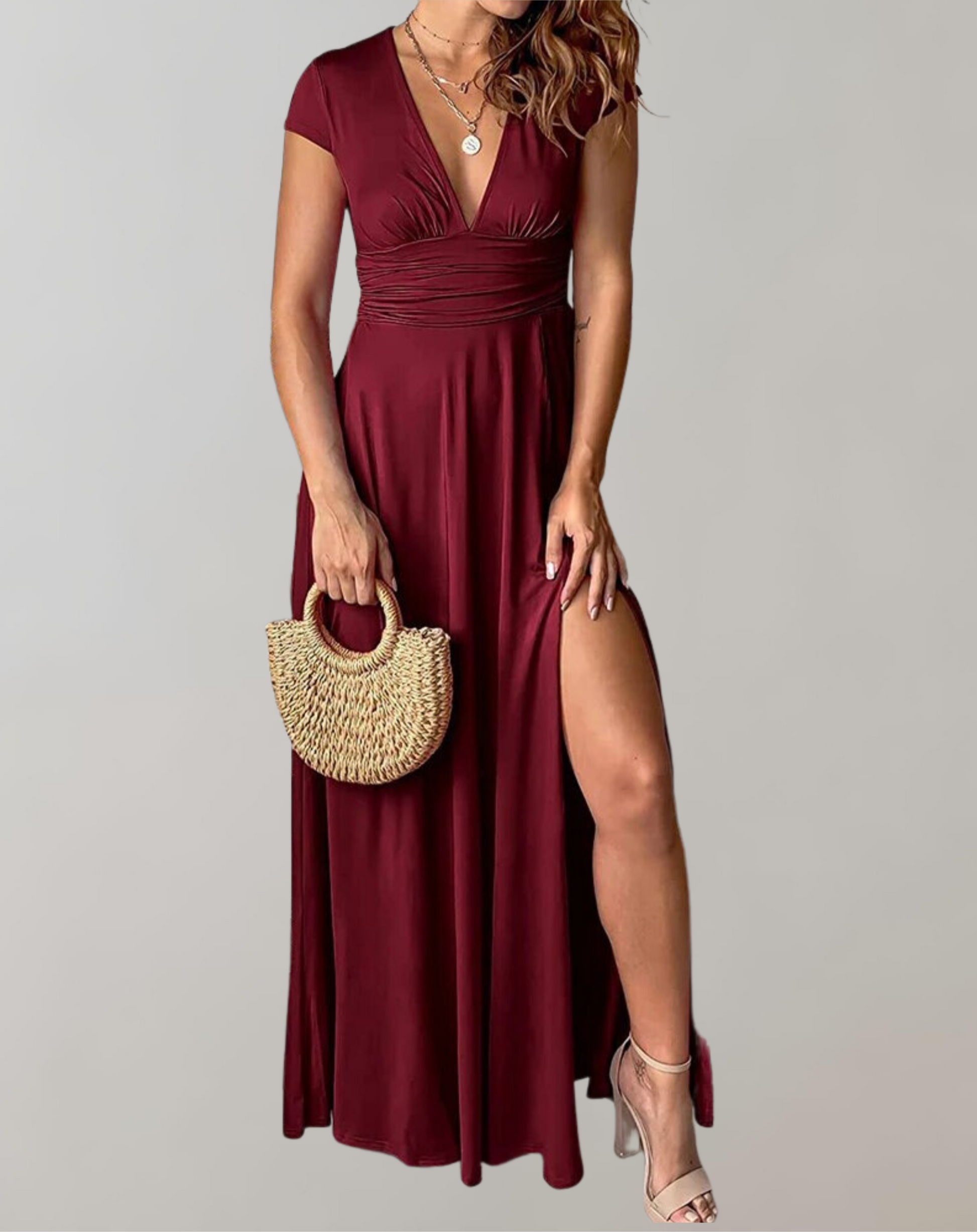 Kobieca Sukienka Koktajlowa z Plisowanym Pasem i Głębokim Dekoltem w Kształcie V