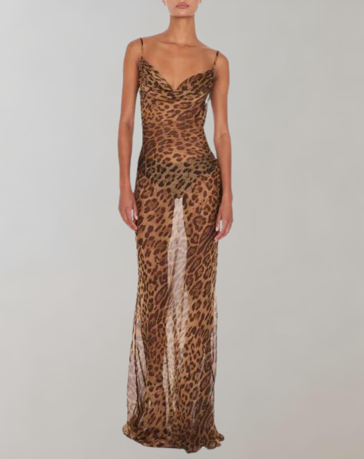 Kobieca Elegancka Tkanina Sukienka Maxi z Wzorem Lamparta na Wesele