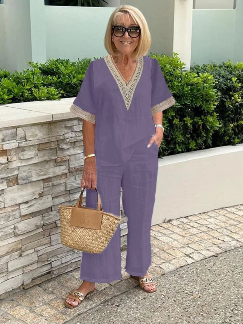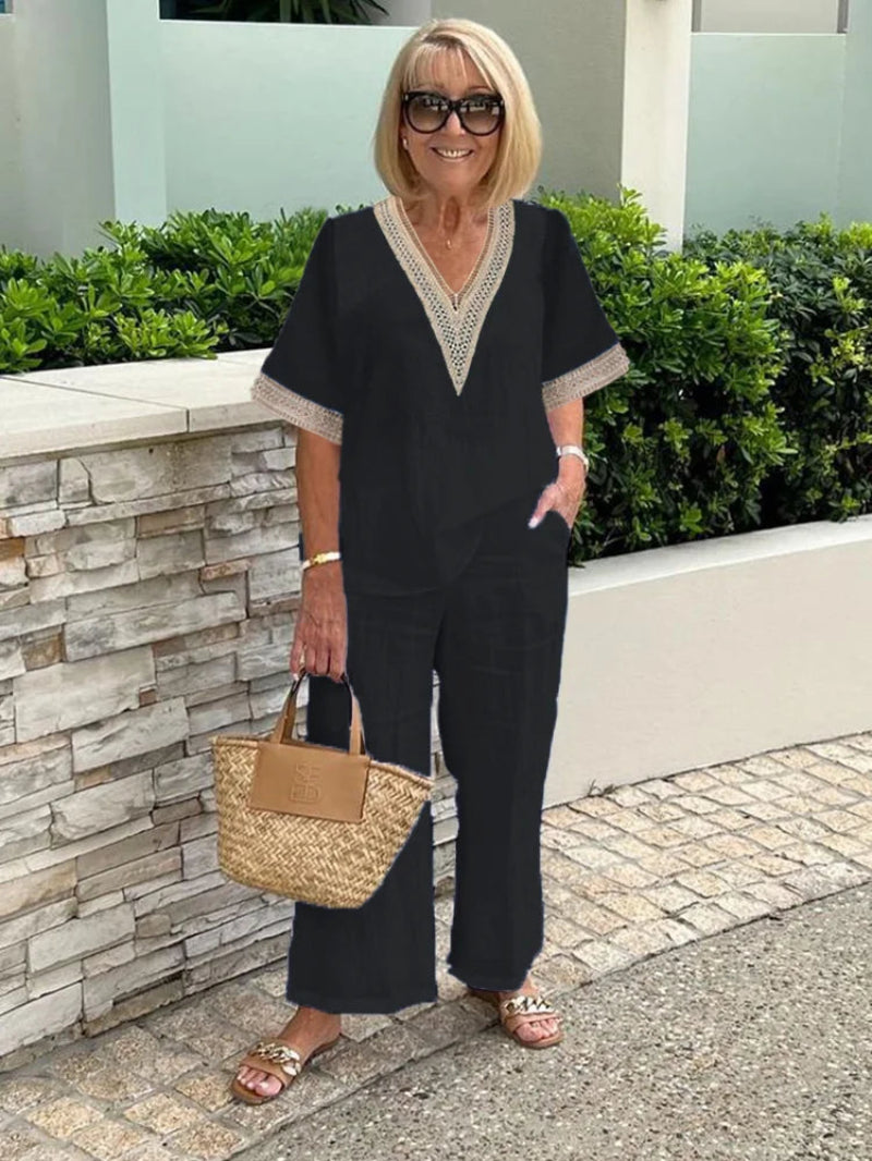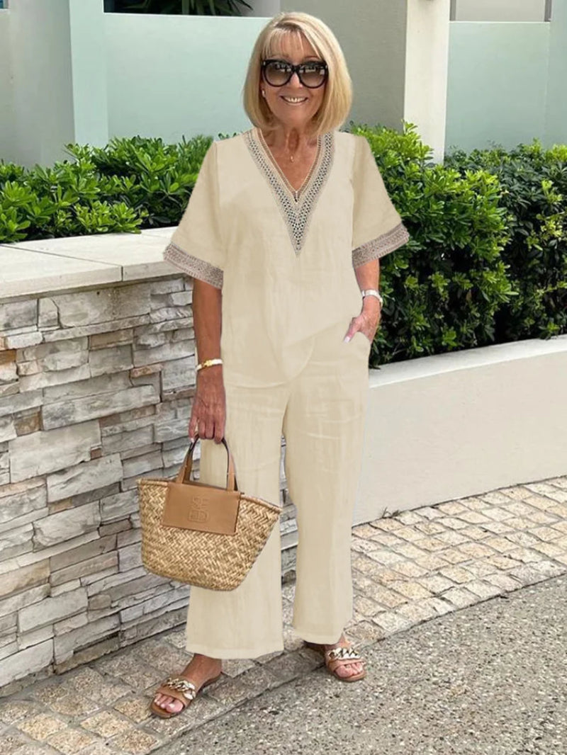 Kobiety Stylowy Bawełniany Zestaw Oversize z Dekoltem w Serek