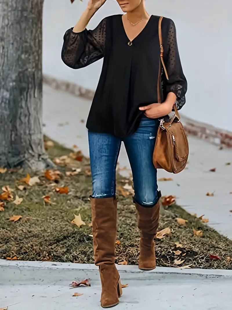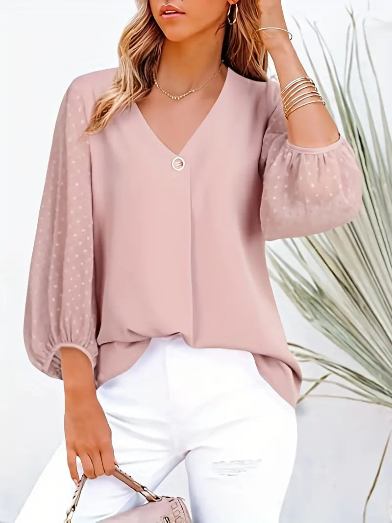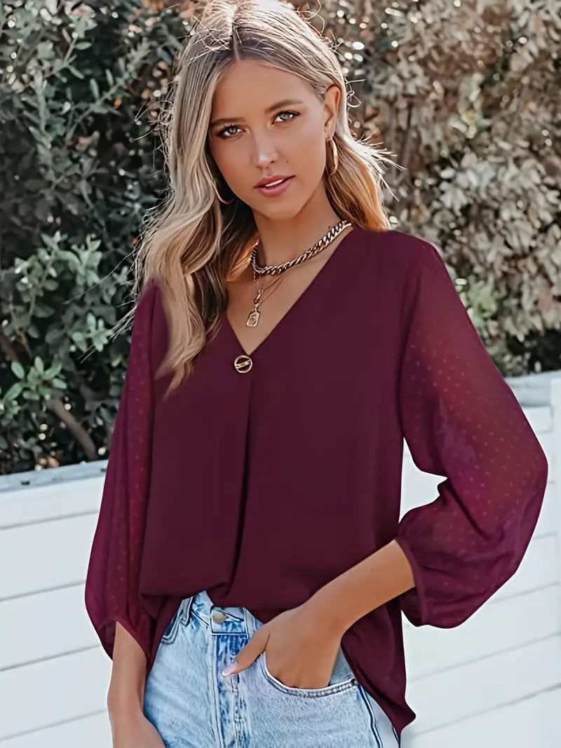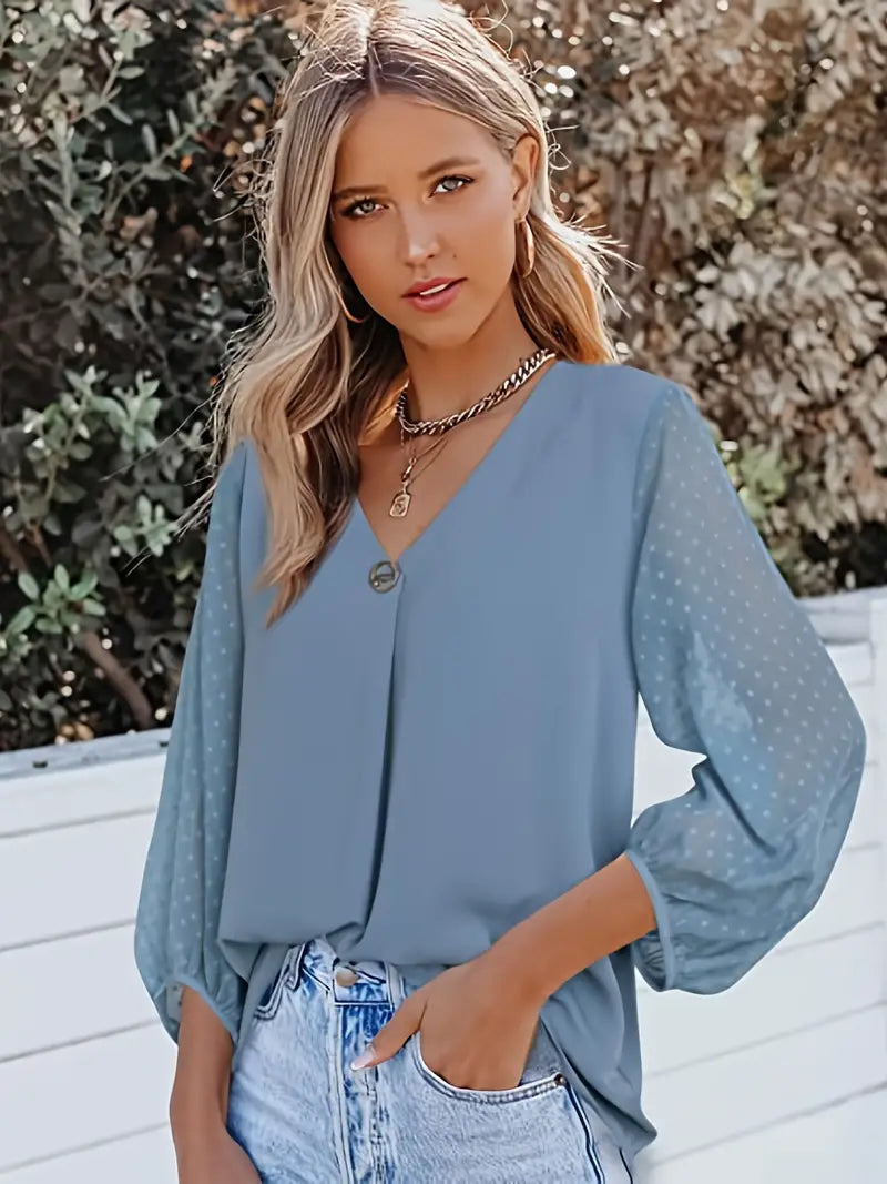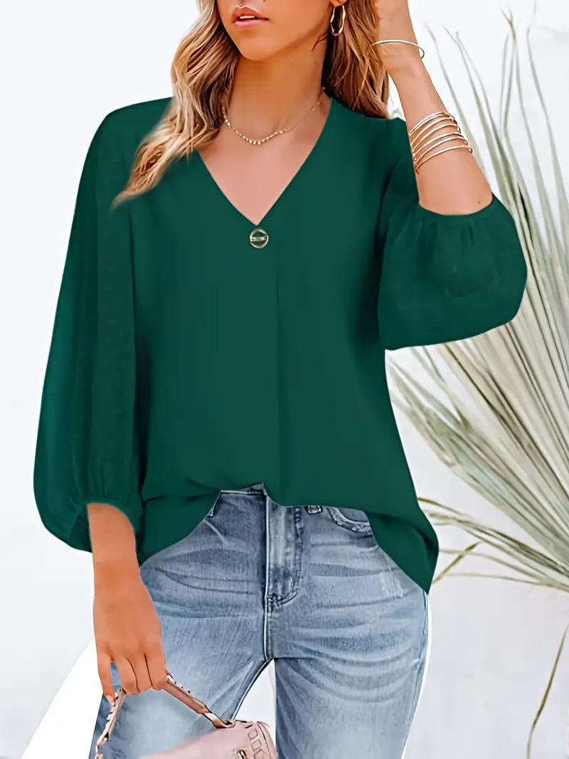 Luźna Bluzka Damska z Dekoltem V i Rękawami 3/4