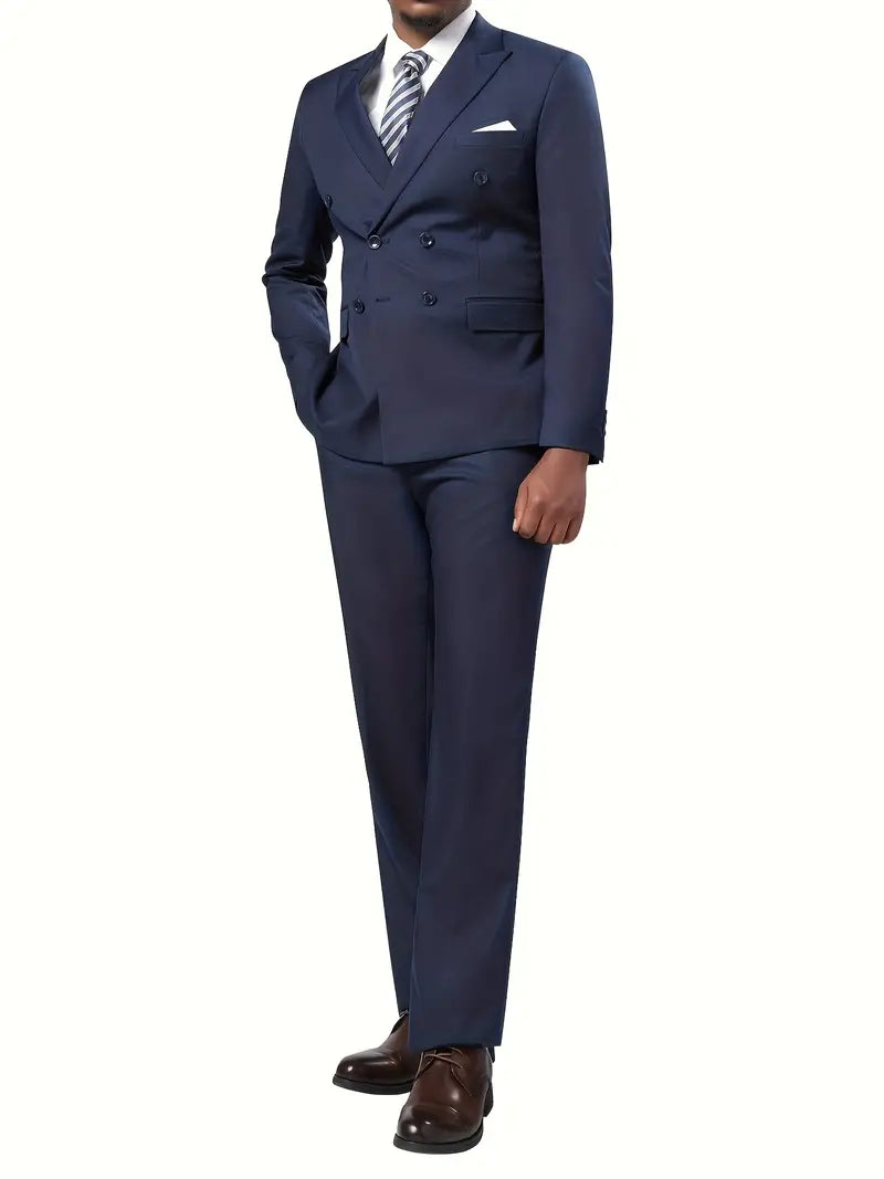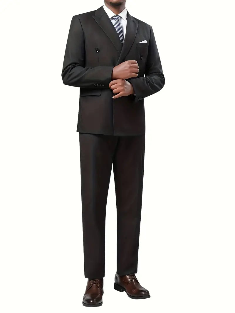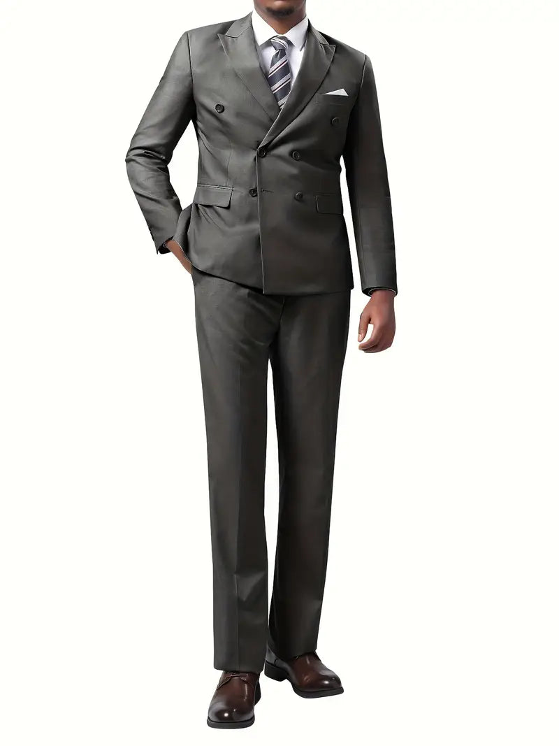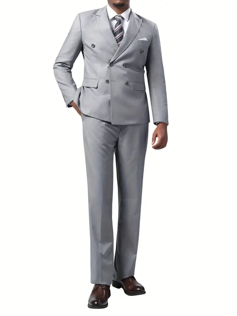 Dwuczęściowy garnitur męski z marynarką dwurzędową i dopasowanymi spodniami to propozycja odpowiednia na oficjalne wydarzenia. Zestaw wyróżnia się prostym krojem, który pozwala na swobodę ruchów i uniwersalne dopasowanie do różnych dodatków. Można go zestawić z koszulą i krawatem na specjalne okazje lub z lżejszymi elementami garderoby w cieplejszym sezonie.