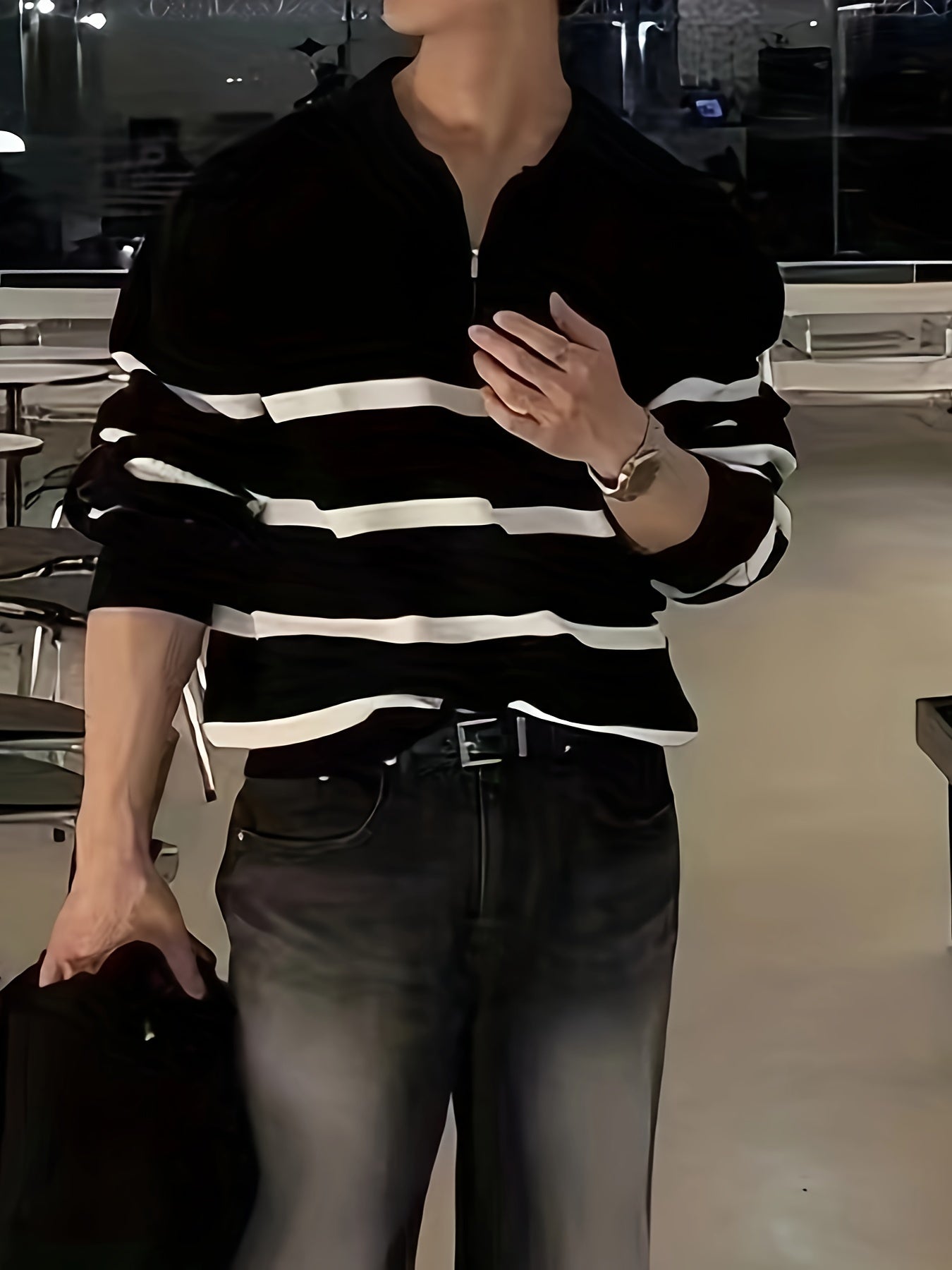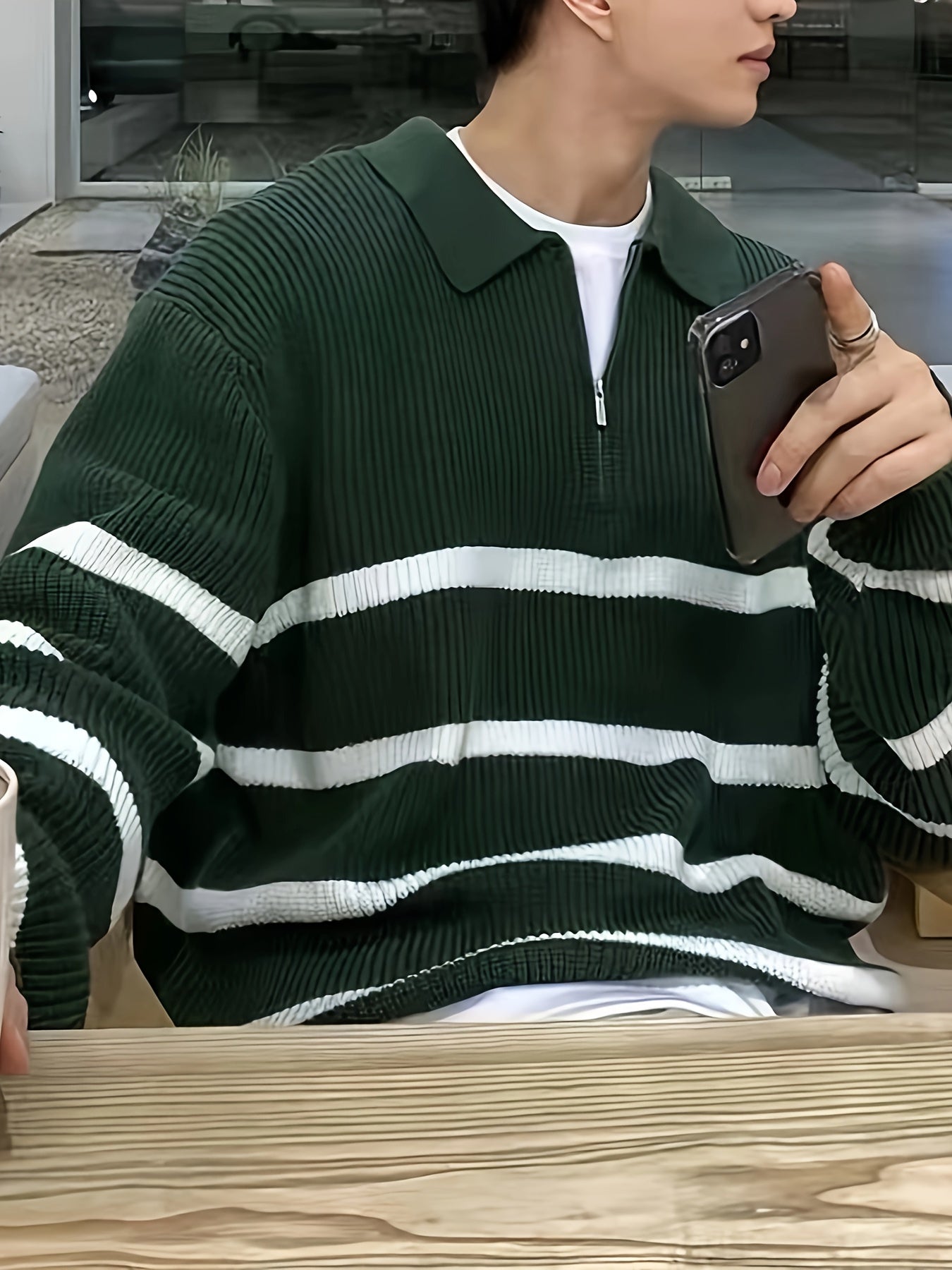 Odkryj nasz sweter męski casualowy z półzamkiem w paski, idealny na chłodne dni. Ten stylowy sweter łączy w sobie komfort i nowoczesny design, co czyni go doskonałym wyborem na jesień i zimę. Wykonany z wysokiej jakości materiałów, zapewnia ciepło i wygodę, idealny na spacery w parku lub relaks w domowym zaciszu.