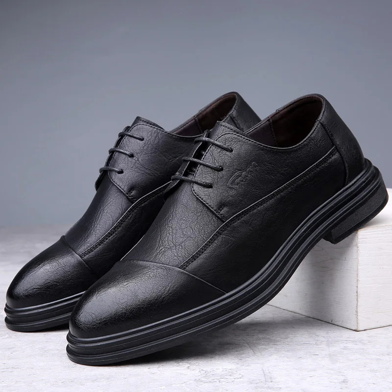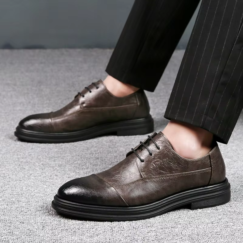 Te eleganckie skórzane buty męskie to idealne połączenie stylu i komfortu dla nowoczesnego mężczyzny. Wykonane z wysokiej jakości skóry, charakteryzują się klasycznym designem cap toe, który nadaje im elegancki wygląd, idealny na formalne okazje. Komfortowa podeszwa zapewnia wygodę noszenia przez cały dzień, co czyni je doskonałym wyborem na długie godziny spędzone na nogach.